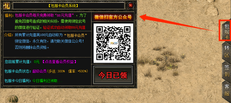 问:我已经充值满100元了,怎么领取包服卡奖励? 答:1.只要是75CQ游戏旗下的游戏,游戏屏幕右侧都有一个《包服卡》按钮! 答:2.进入游戏后绑定微信即可直接领取包服卡用户奖励! 答:3.所有版本通用(绑定微信、任意账号都行)! |
